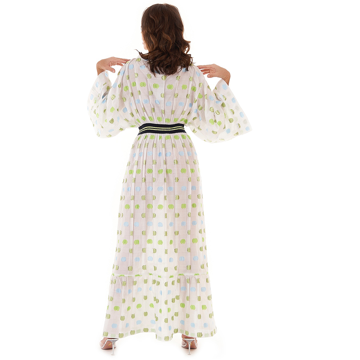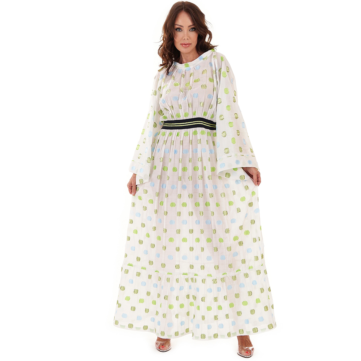 Rochie maxi cu buline și volan de culoare alb. Rochia evidențiază zona taliei cu un cordon elastic. Guler larg înalt rever . Croi larg, cloș cu lungime maxi și mâneci lungi bufante. Transparentă. Culoare: Alb. Compoziție: 45% Bumbac 40% Polyester 5% Elastan 10% Acrilic. Modelul poartă mărimea 38. Bust: 88 cm Înălțime: 178 cm Șolduri: 92 cm Talie: 62 cm Check out our size guide Questions on Email
