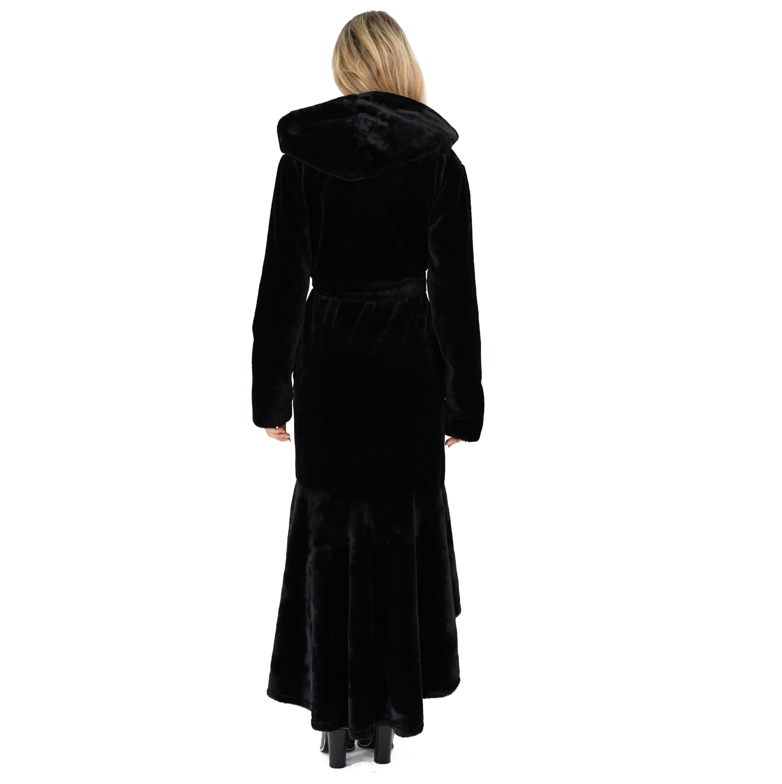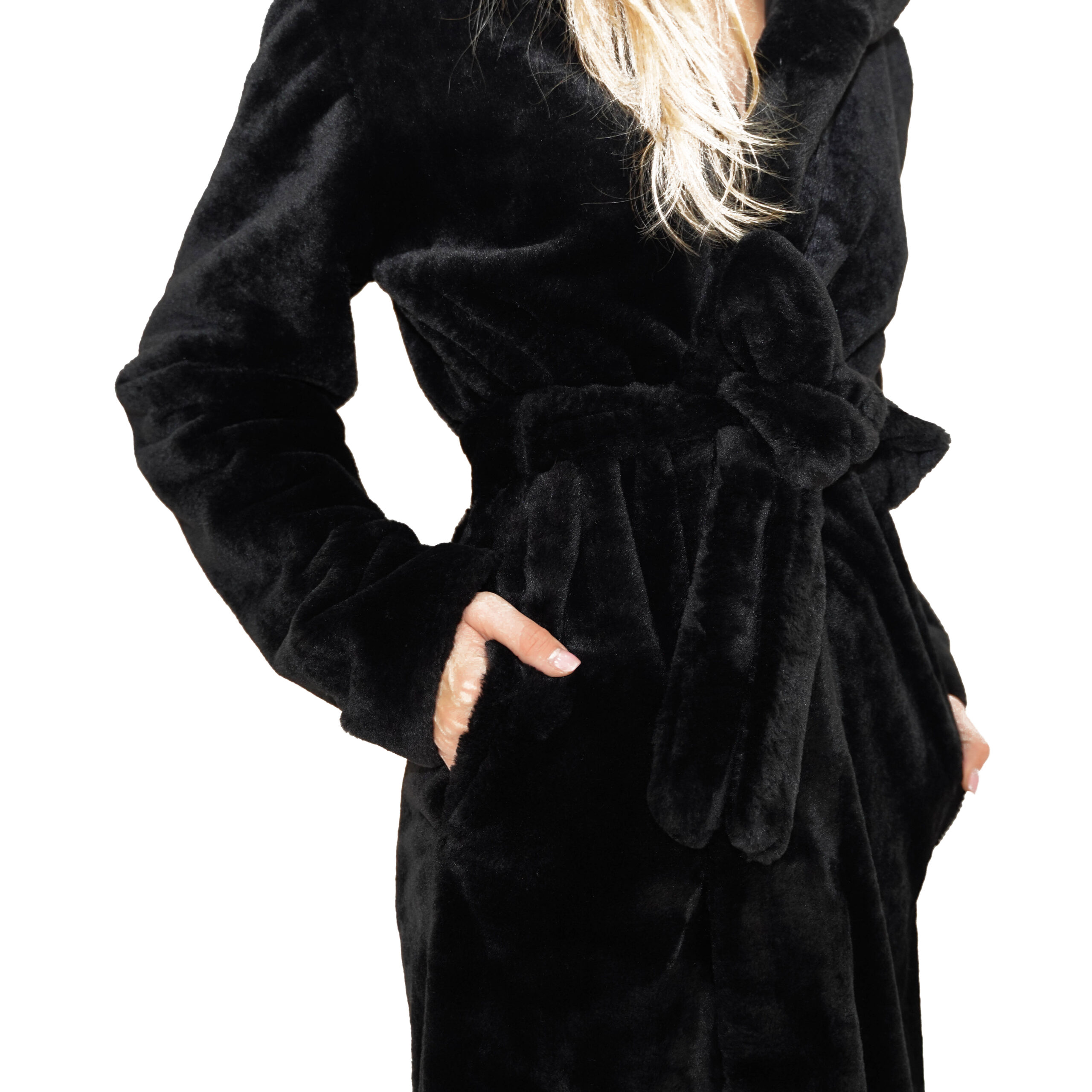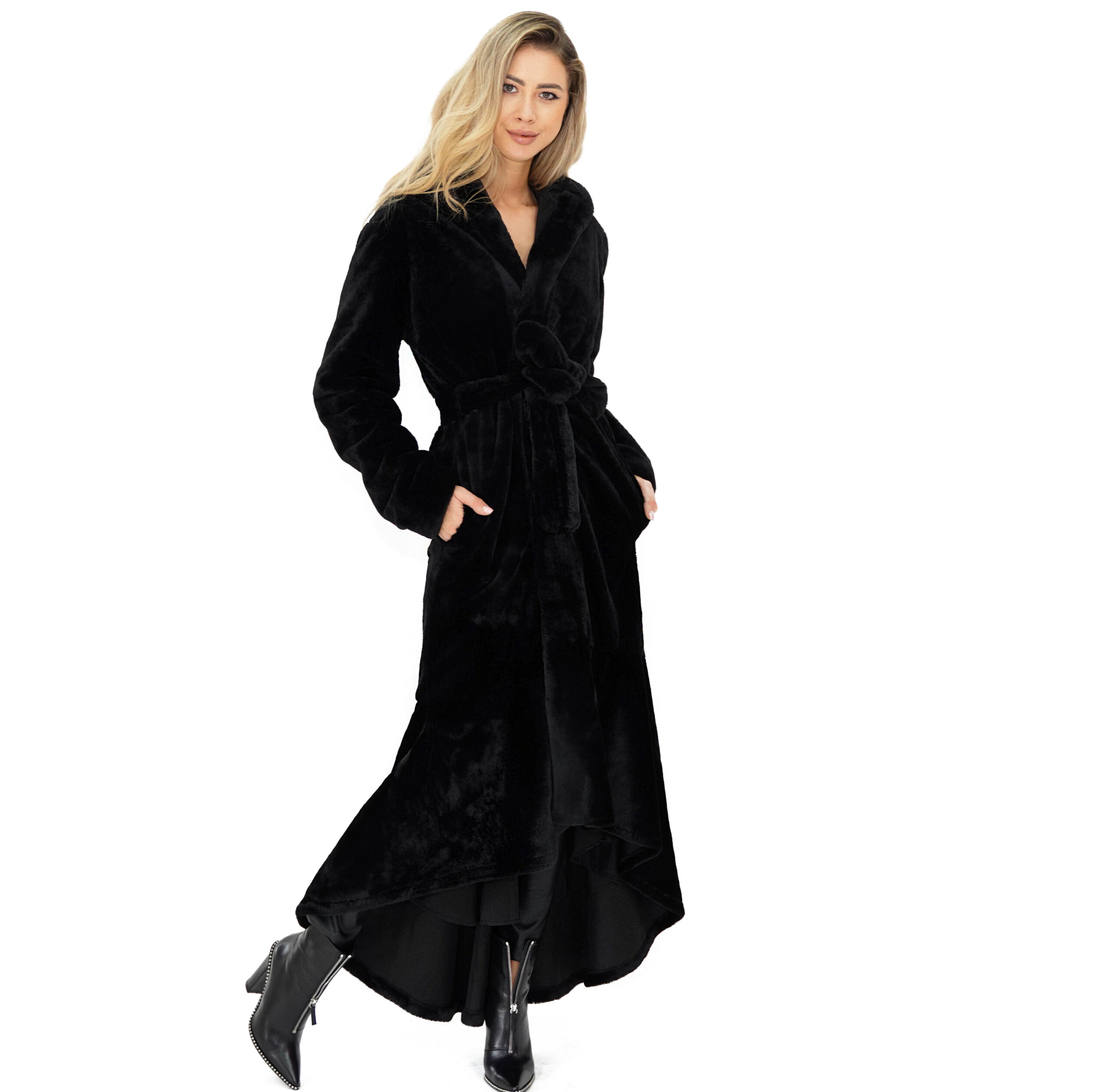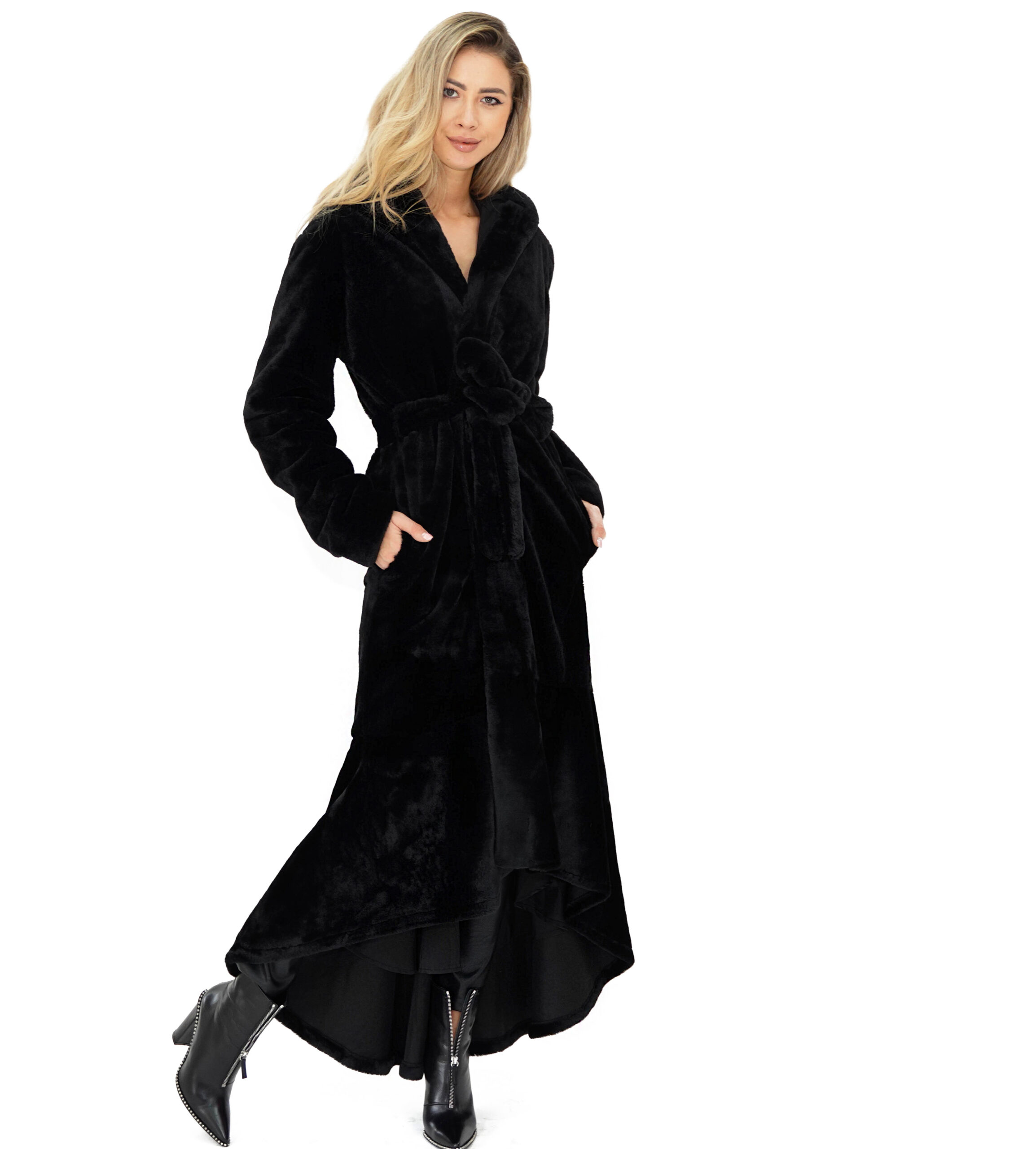 Haină de damă, lungă, din blană ecologică tip sirena. Cordon aplicat detașabil, din aceeași țesătură. Buzunare laterale deschise. Glugă nedetașabilă.