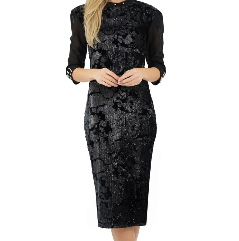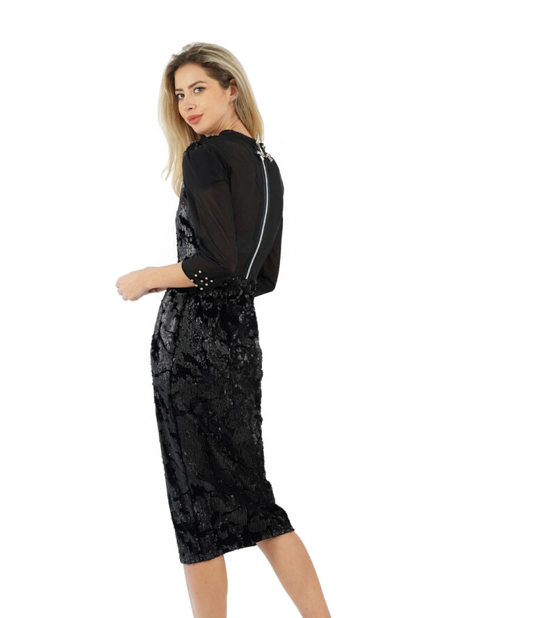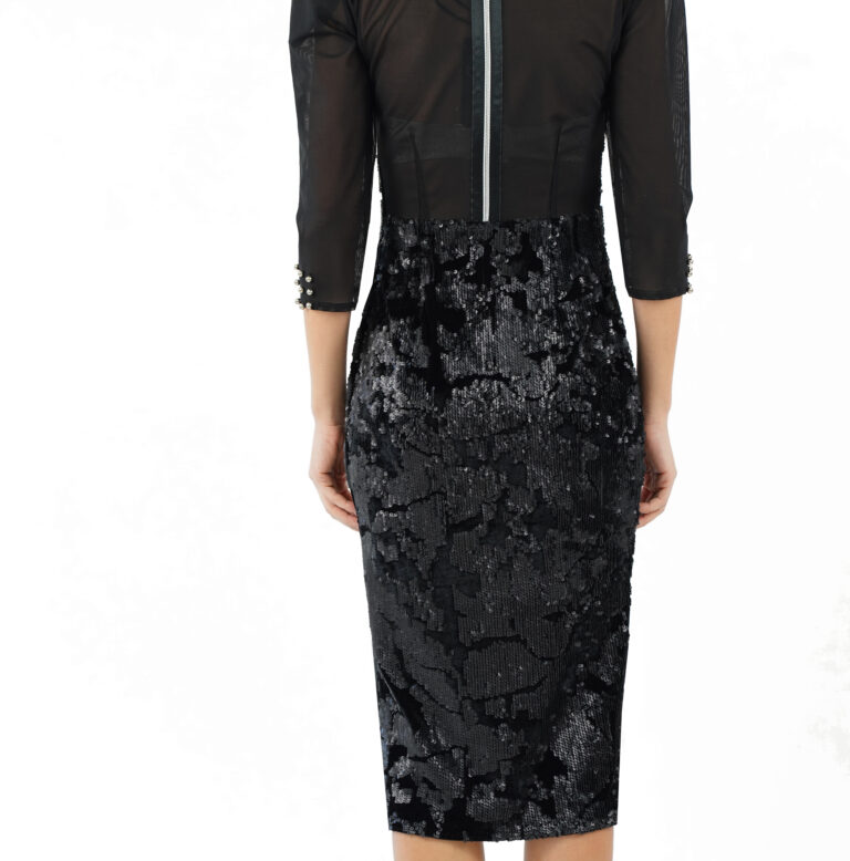 Black evening dress with sequins.Long net sleeves with pearl details. Round neckline with pearls. Slim fit. Back white zipp closure.