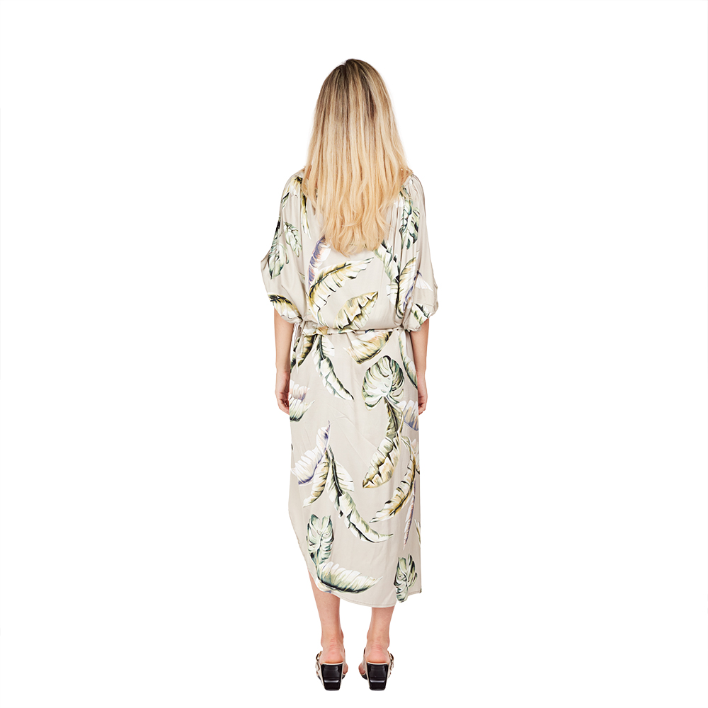 Long dress with print. Wrap front. Boat neckline. 3/4 Sleeves with narrow cuffs. Elastic waistband with flounces. Colorful print fabric. Can be weared as an elegant, but also casual dress.