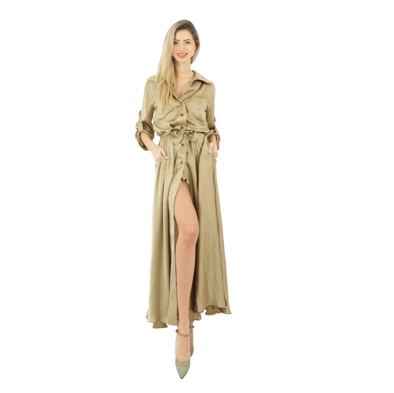 Long sleeve beige/kaki dress. Front buttons and tie belt closure. Your choice to leave it open with slit or not. Front pockets on chest line and two pockets on bottom. High neckline.