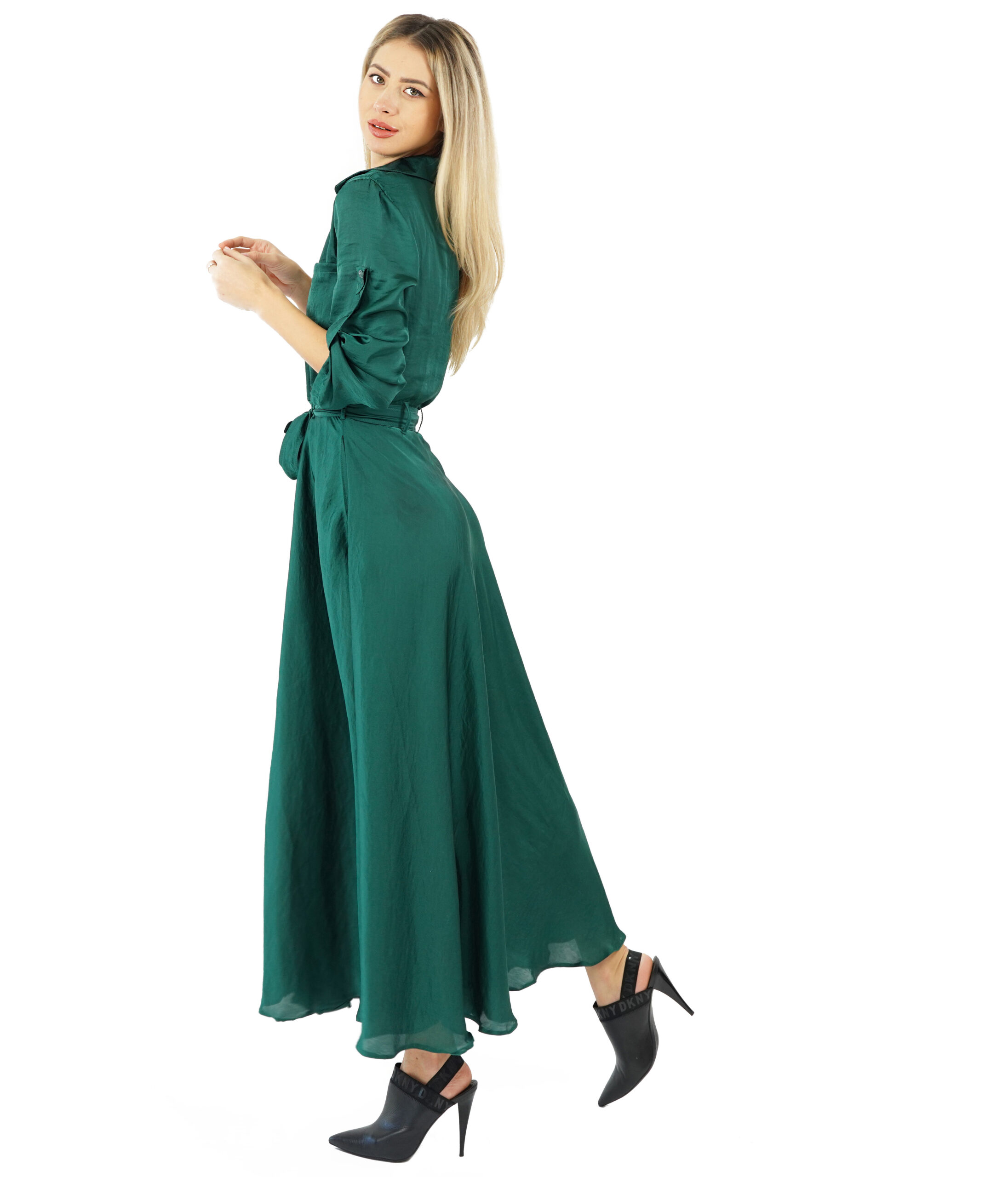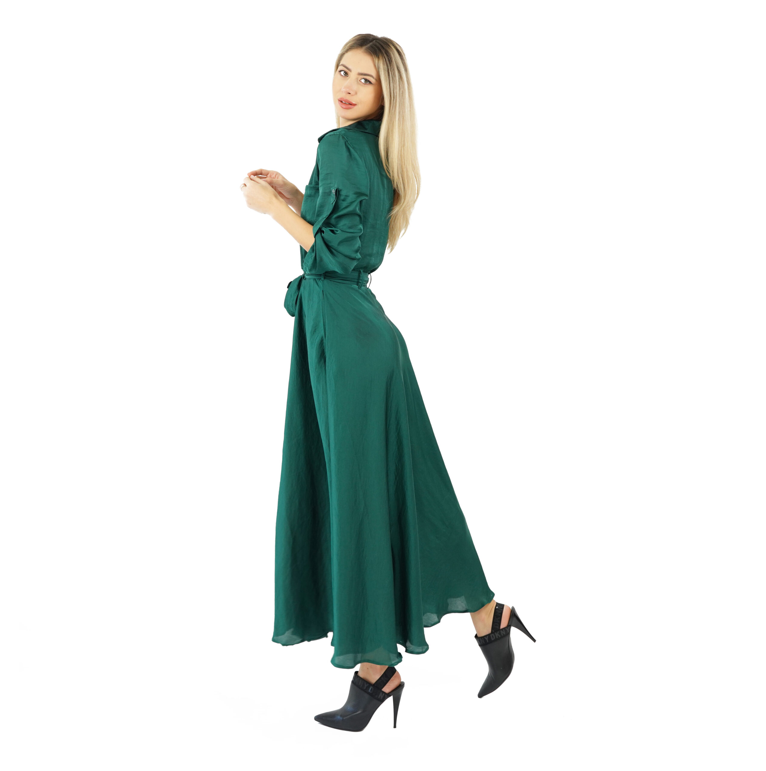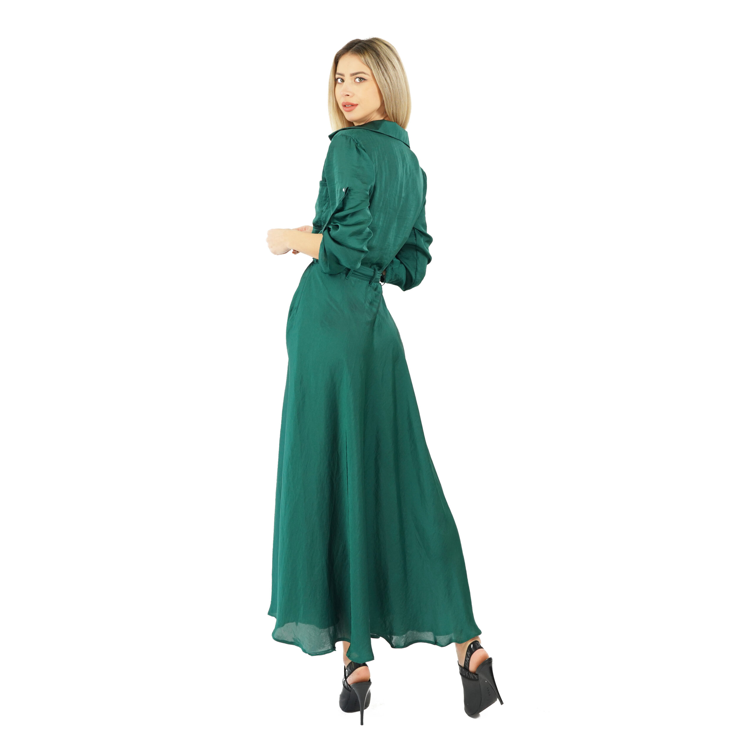 Emerald long dress with buttons and ribbon