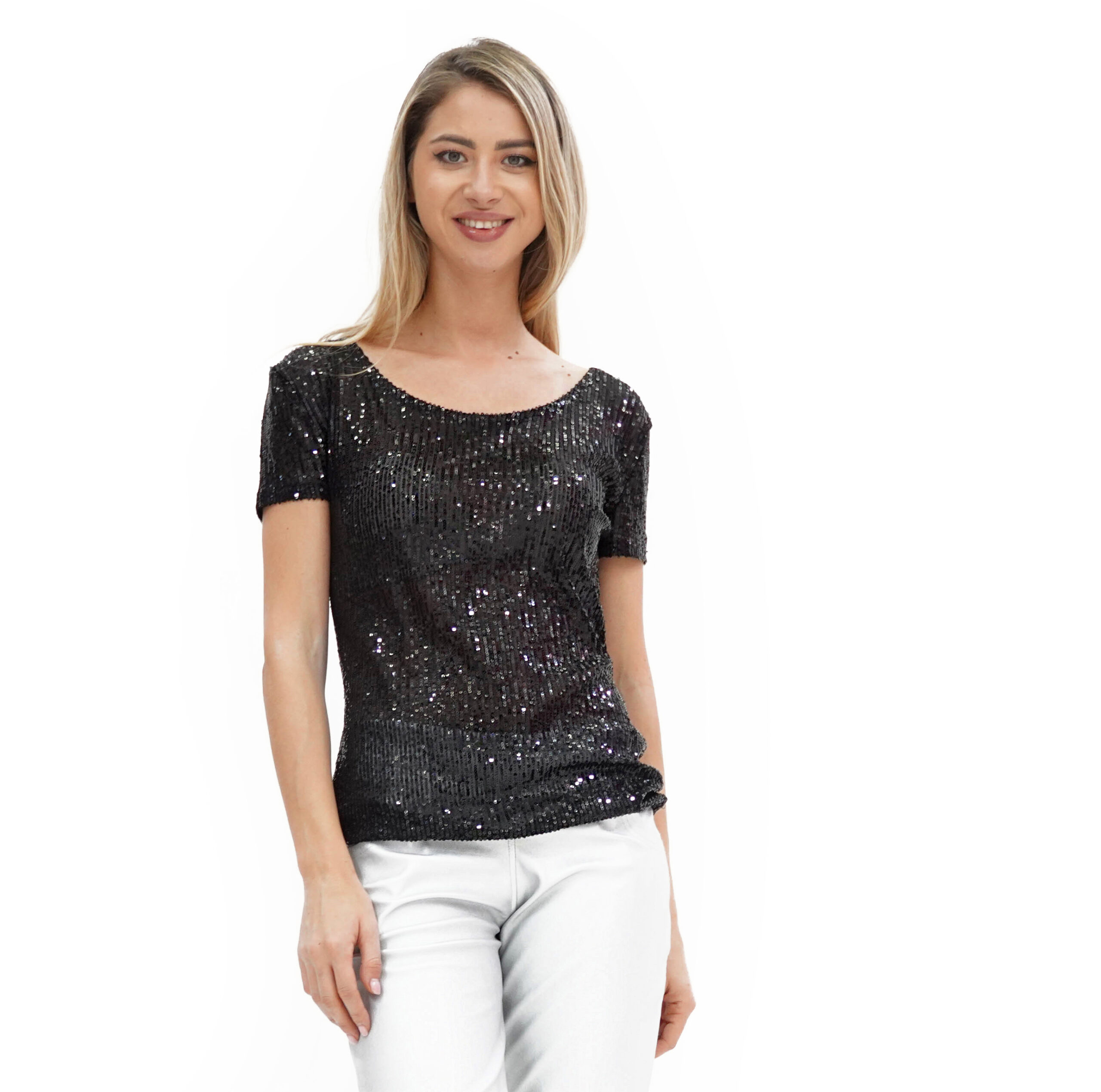 Bluză damă cu paiete stil sport chic. Mânecă scurtă. Guler rotund.