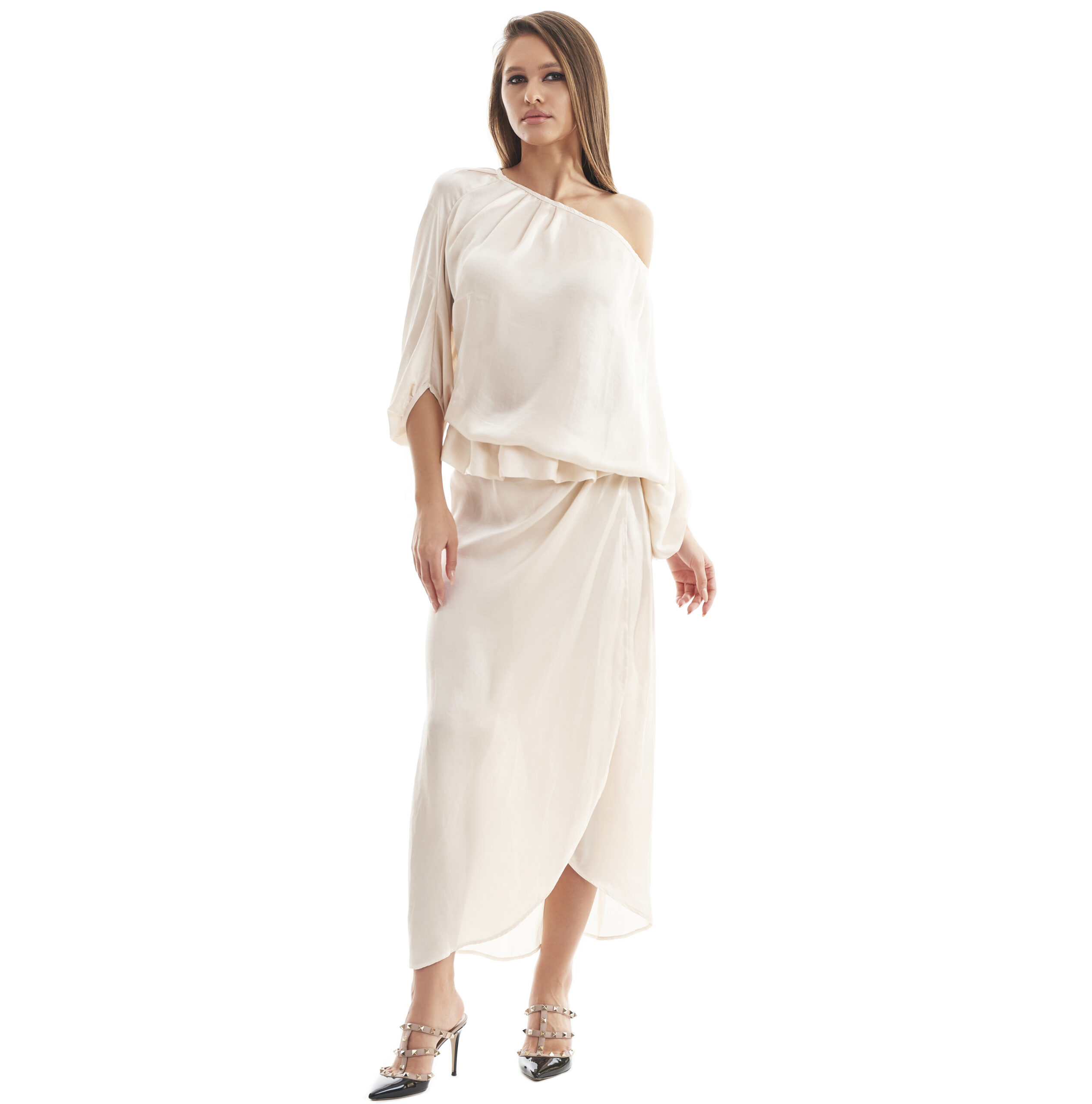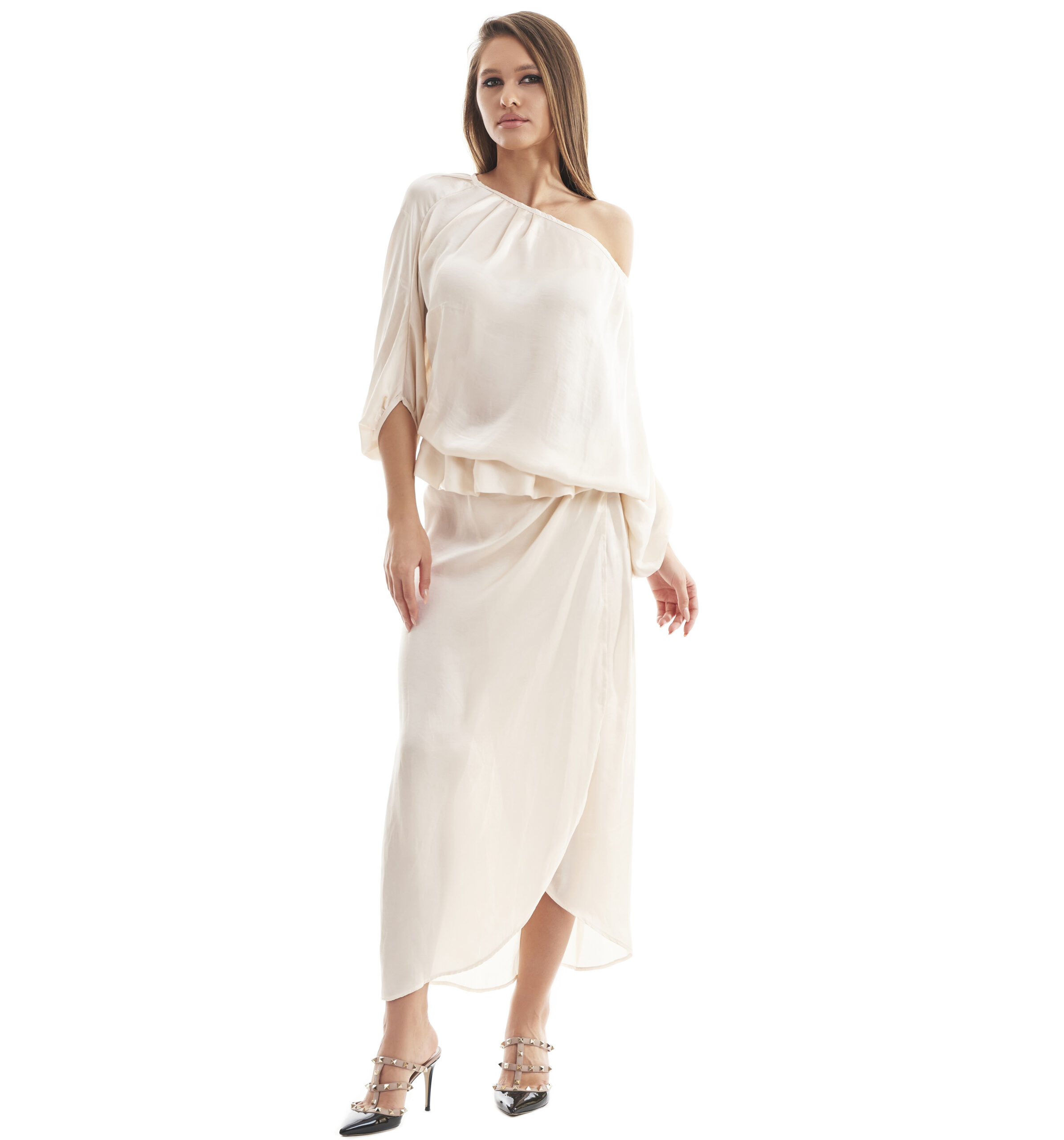 Rochie de seară lungă petrecută în față. Guler tip bărcuță. Mâneci 3/4 care se termină cu manșete înguste. Talie elastică cu detaliu volănașe.