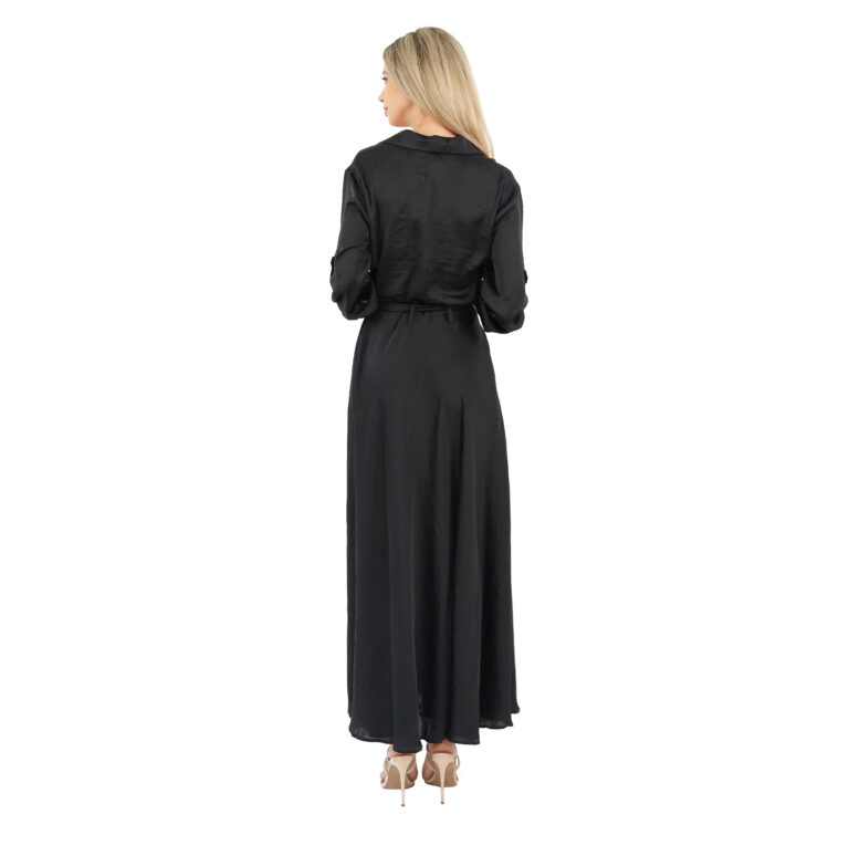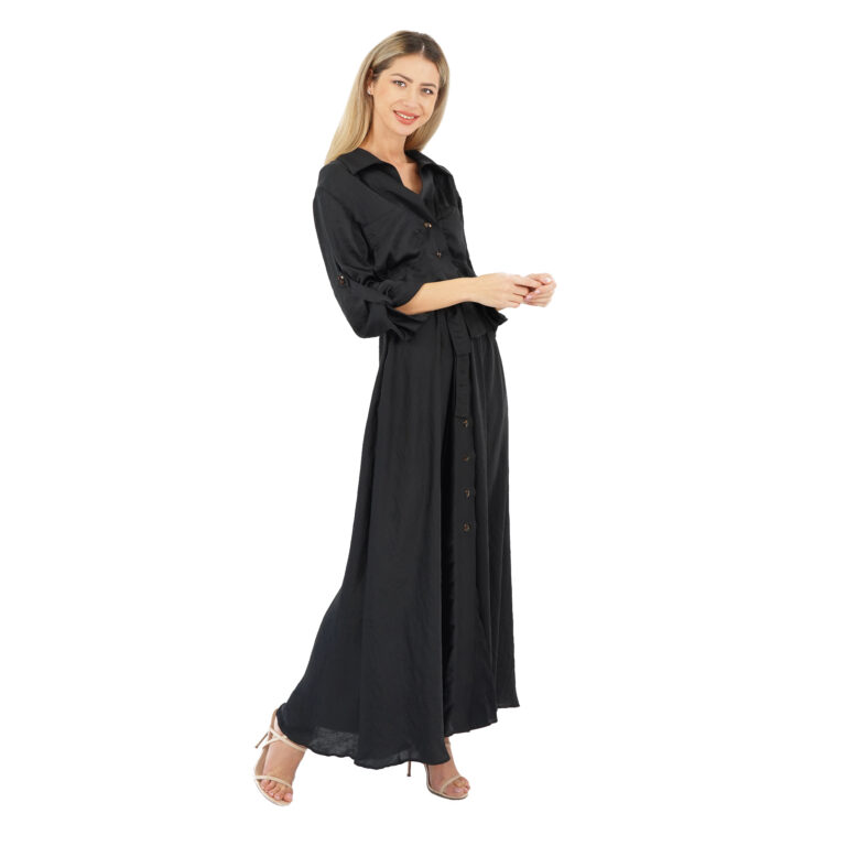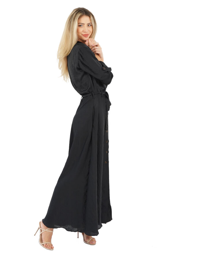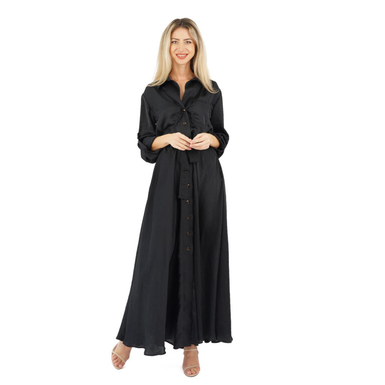 Rochie lungă cu mâneci de culoare neagră. Închiderea se face pe față, cu nasturi de sus până jos, putând să o lași cât de mult o dorești decoltată sau despicată. Rochia evidențiază zona taliei cu un cordon de aceeași culoare. Are două buzunare pe piept și două buzunare la nivelul fustei. Guler înalt rever.