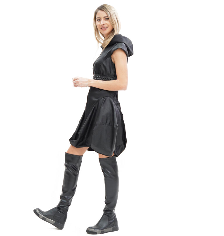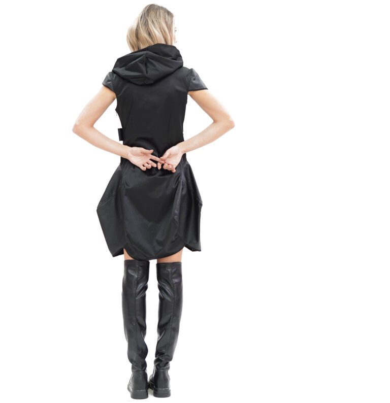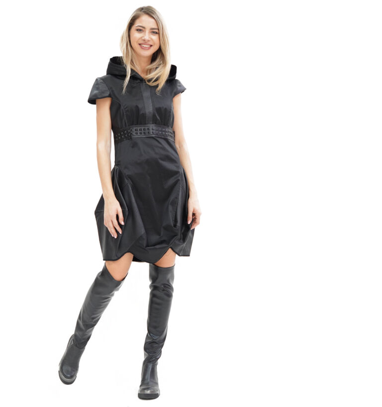 Rochie mini neagră din piele ecologică și satin. Glugă nedetașabilă. Mânecă scurtă. Închidere laterală cu fermoar ascuns de cusătură. Cordon tip curea cu ținte aplicate.