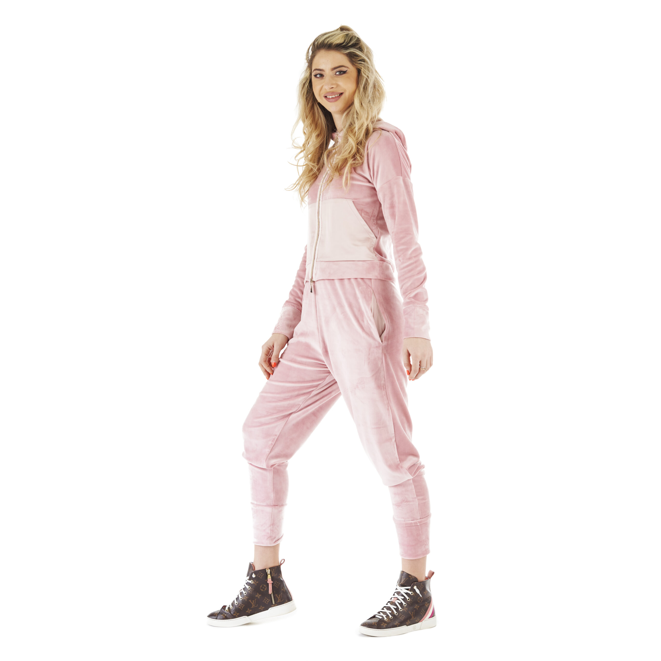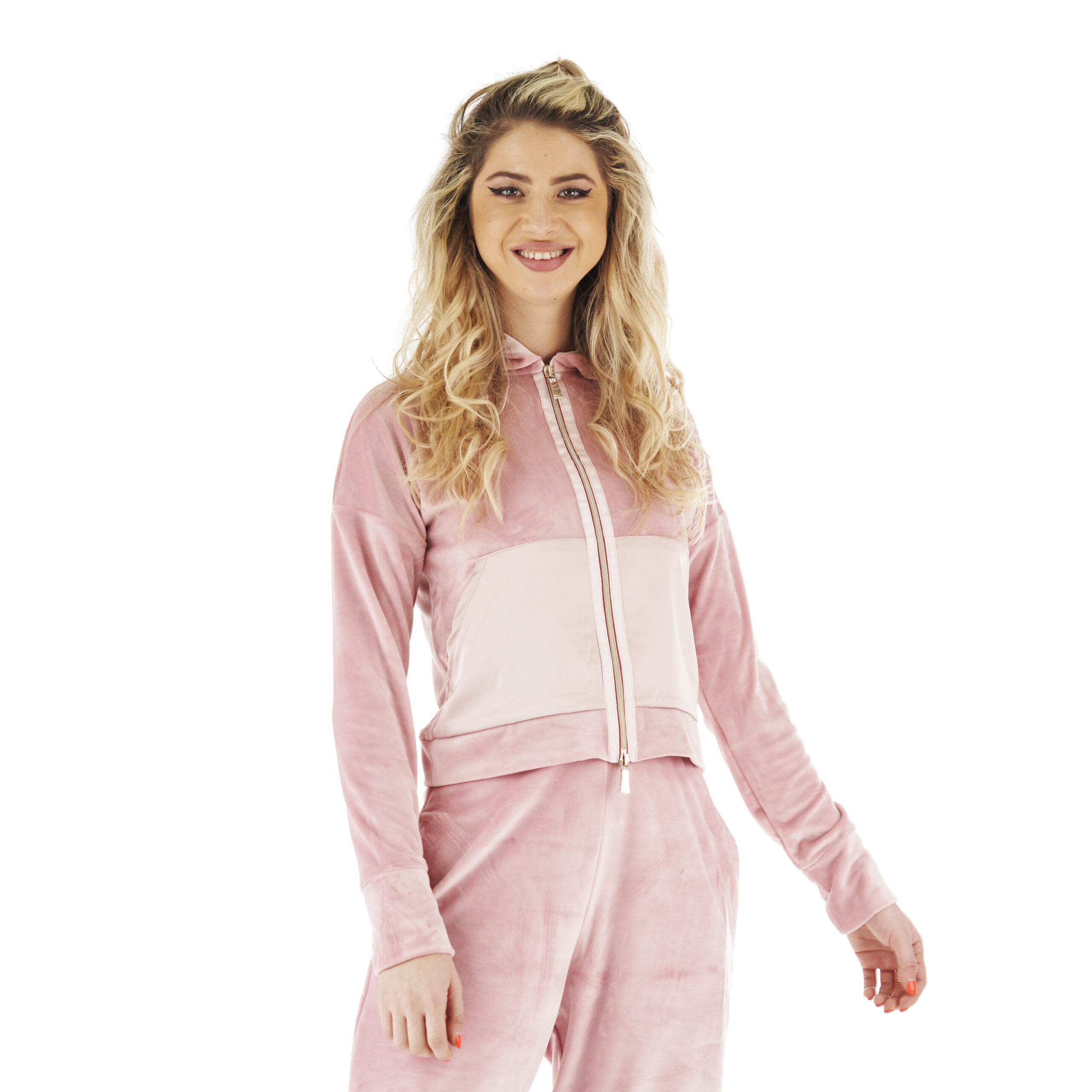 Trening damă sport chic din catifea roz cu glugă