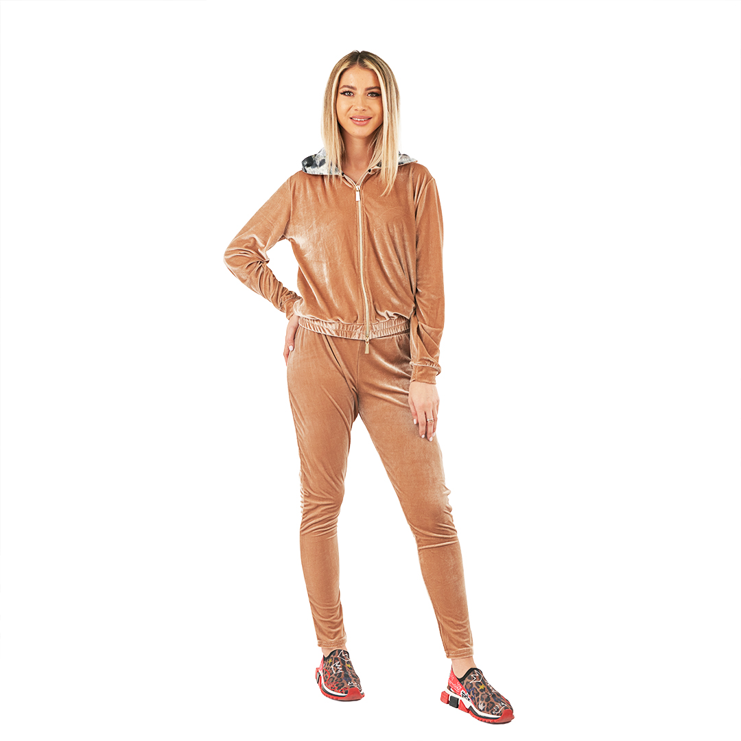 Trening de damă urban-chic din catifea bej, moale. Bluză cu glugă nedetașabilă. Închidere pe față cu fermoar auriu. Buzunare laterale cu acces liber căptușite cu material cu imprimeu animal print gri. Mâneci cu manșete late. Baza bluzei de trening elastică.