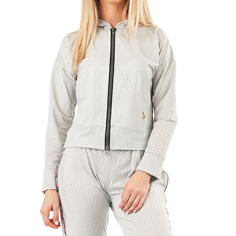 Trening de damă din material de plasă gri. Bluză cu glugă nedetașabilă căptușită cu plasă neagră. Închidere pe față cu fermoar gri închis. Buzunare laterale cu acces liber. Mâneci cu manșete late. Baza bluzei de trening elastică.