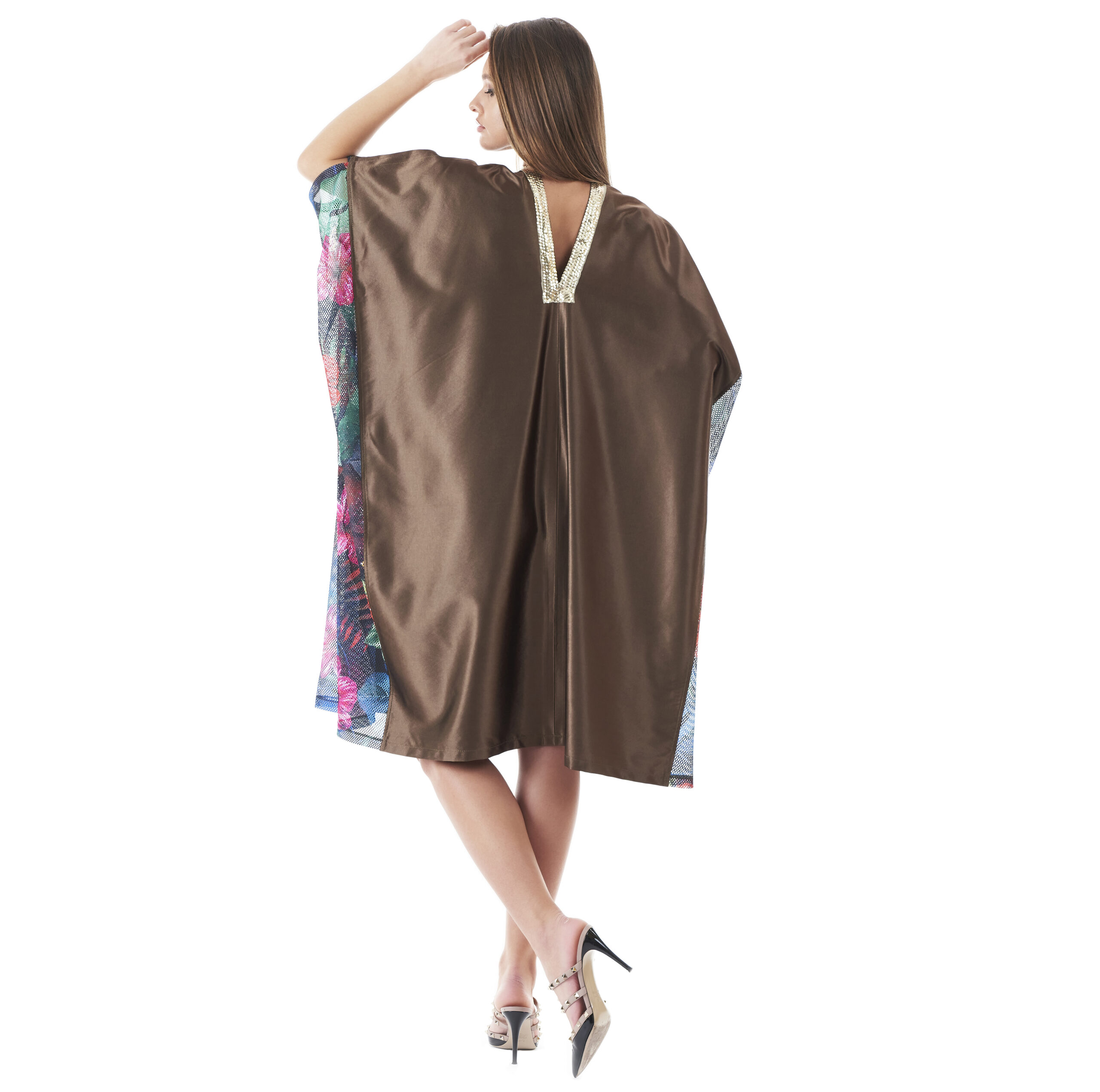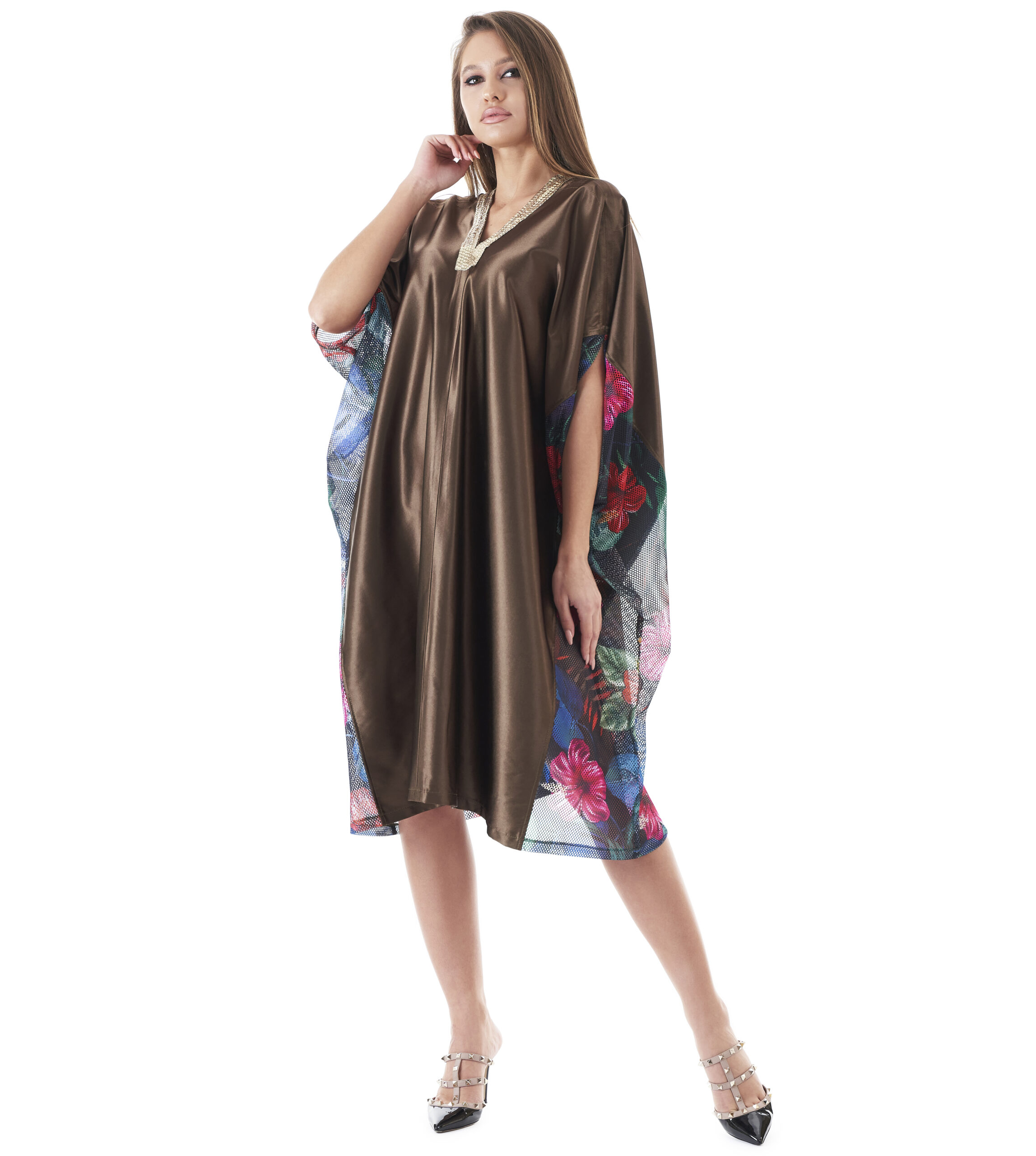 Tunică elegantă kaki vaporoasă cu imprimeu floral, de vară. Detalii aurii din paiete pe marginea decolteului.